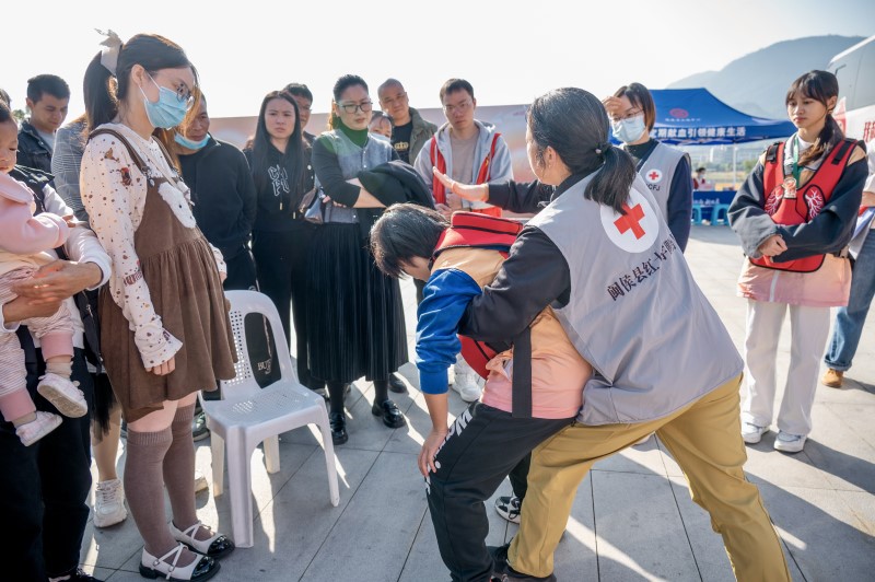 闽侯县红十字服务团在现场宣传普及应急救护知识,通过“讲解+演示”相结合的方式,现场教授心肺复苏、气道异物梗阻等急救技能,吸引不少市民驻足学习与实操。