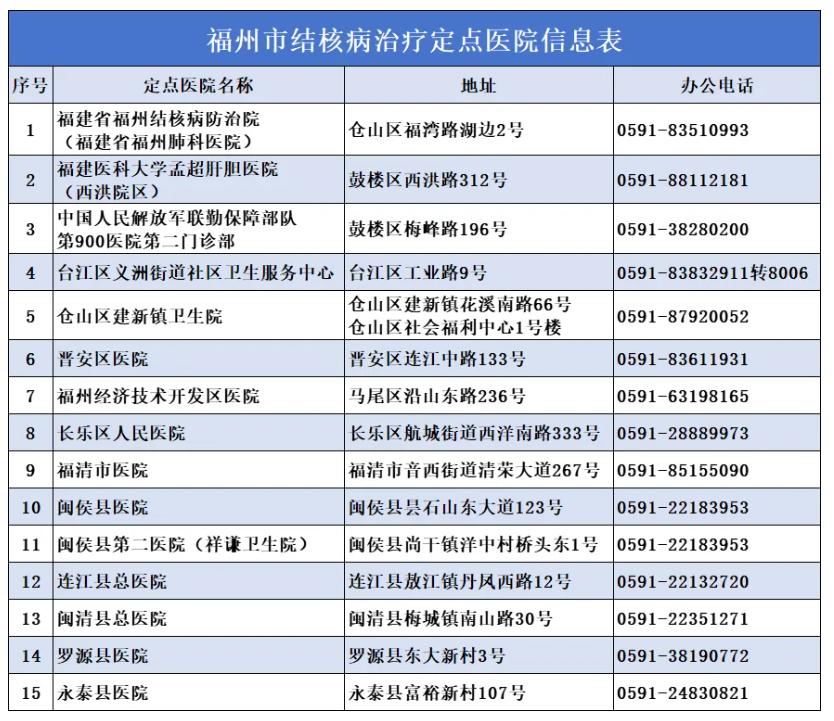 各地均设有结核病定点医疗机构,怀疑得了肺结核,要及时就诊,福州市结核病定点医疗机构共有15所,具体名单如下。