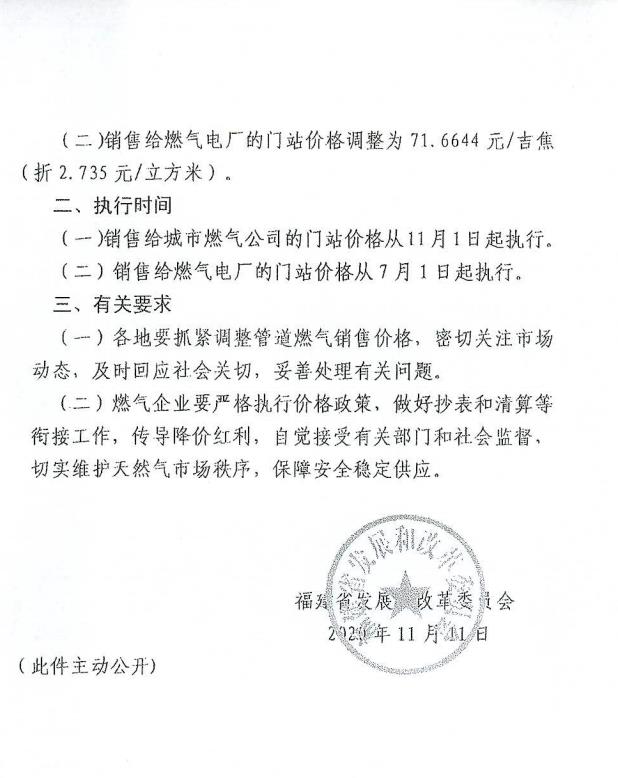 现将《福建省发展和改革委员会关于调整中海福建天然气有限责任公司印尼合同天然气门站价格的通知》(闽发改商价[2020]647号)转发给你们,请你们按照文件精神,抓紧下调管道天然气销售价格,将降价空间全额传导至终端用户。